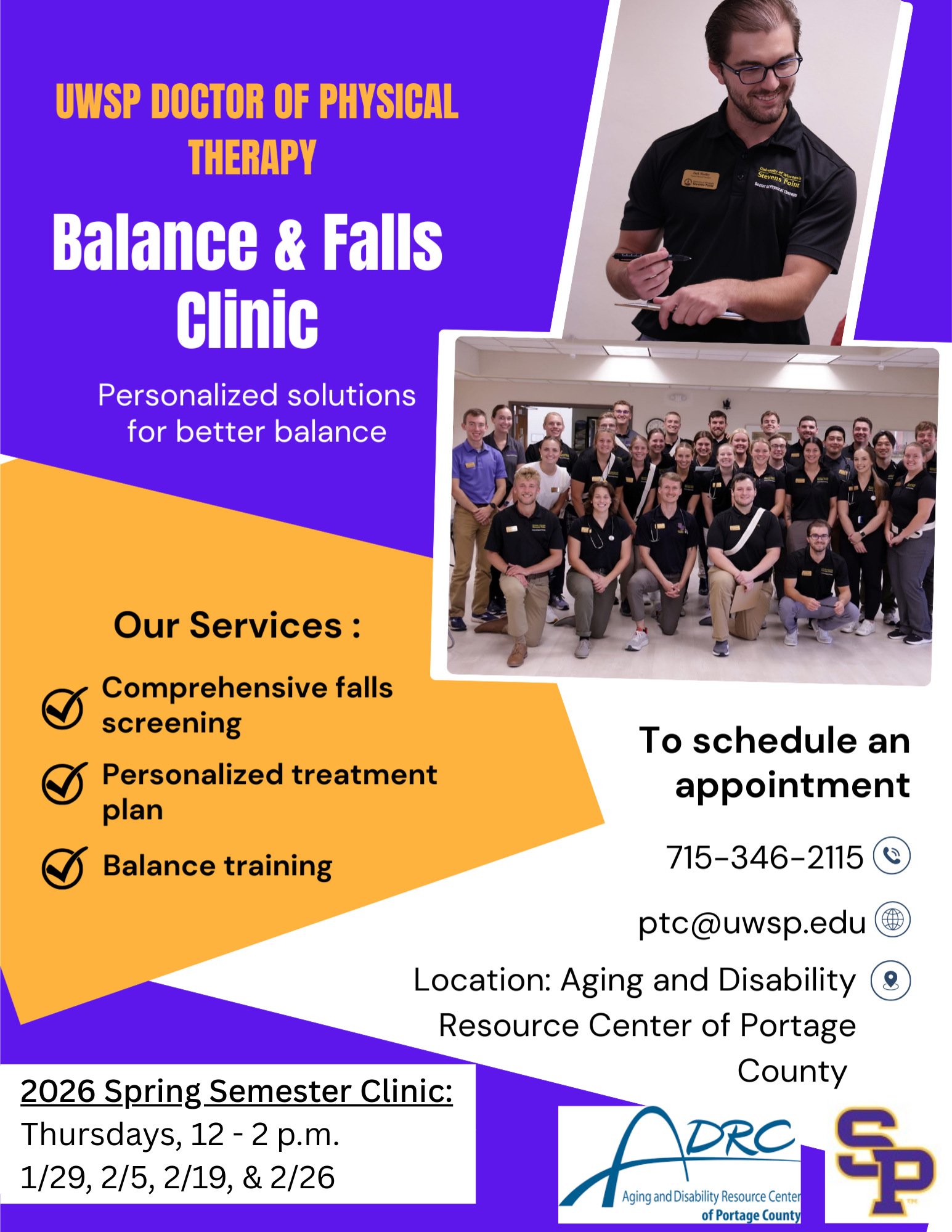 The Aging and Disability Resource Center of Portage County partners with UW-Stevens Point Doctor of Physical Therapy program to host Balance & Falls Clinics. Students provide comprehensive falls screening, a personalized treatment plan, and balance training.